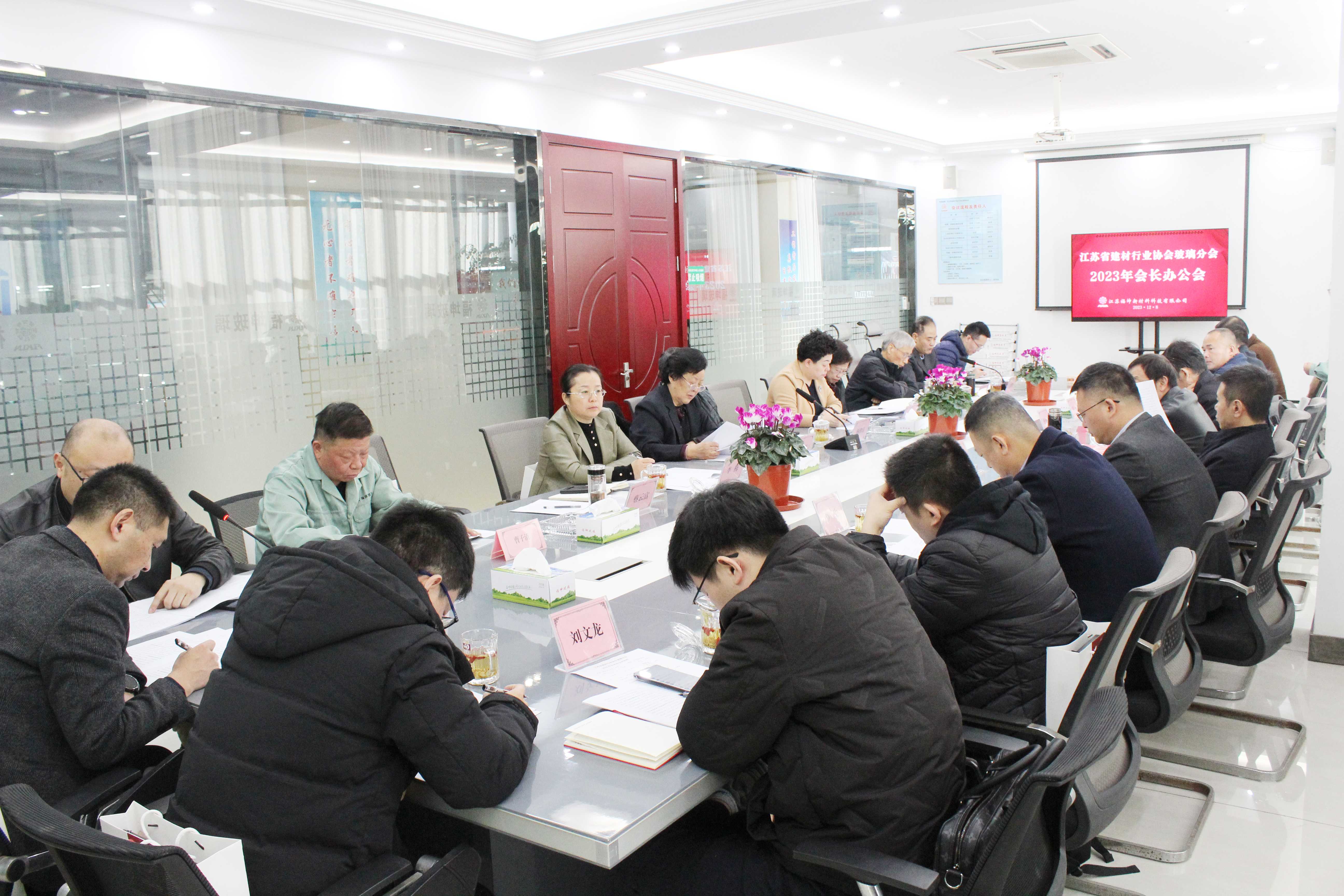 12月8日,江蘇省建材行業協會玻璃分會2023年會長辦公會在江蘇福坤新材料科技有限公司召開,江蘇省建材行業協會榮譽會長聶長蘭,執行會長張嵐嶸,副會長魯照寧,副會長、玻璃分會會長楊洪富以及玻璃分會副會長、秘書長、會員單位代表等出席會議。泰州市工信局材料工業處處長李梅、泰興市工信局副局長蔡云富到會講話。會議由省建材行業協會秘書長王繼勝主持。