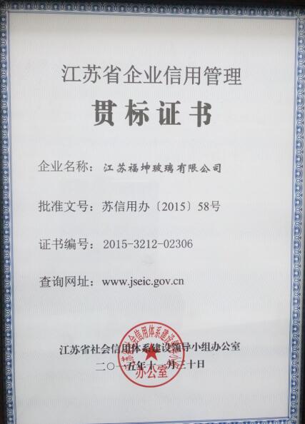 5月23日,江蘇福坤玻璃有限公司獲得“江蘇省企業(yè)信用管理貫標(biāo)證書”。這標(biāo)志著我司在企業(yè)信用管理示范創(chuàng)建工作方面再次邁進(jìn)新的發(fā)展階段。目前,江蘇省確定的2016年首批貫標(biāo)企業(yè)中,我司通過(guò)江蘇省社會(huì)信用體系建設(shè)領(lǐng)導(dǎo)小組辦公室的認(rèn)定.
